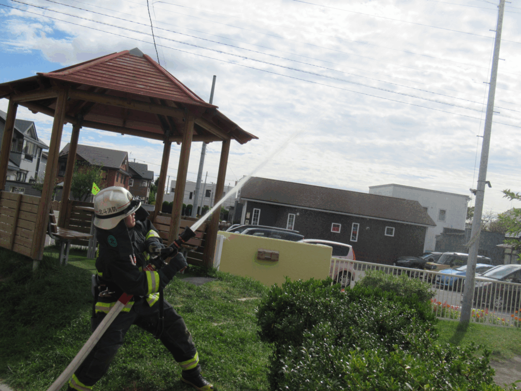 今回は2歳児クラスの湯沸かし器からの火事を想定しての訓練で、