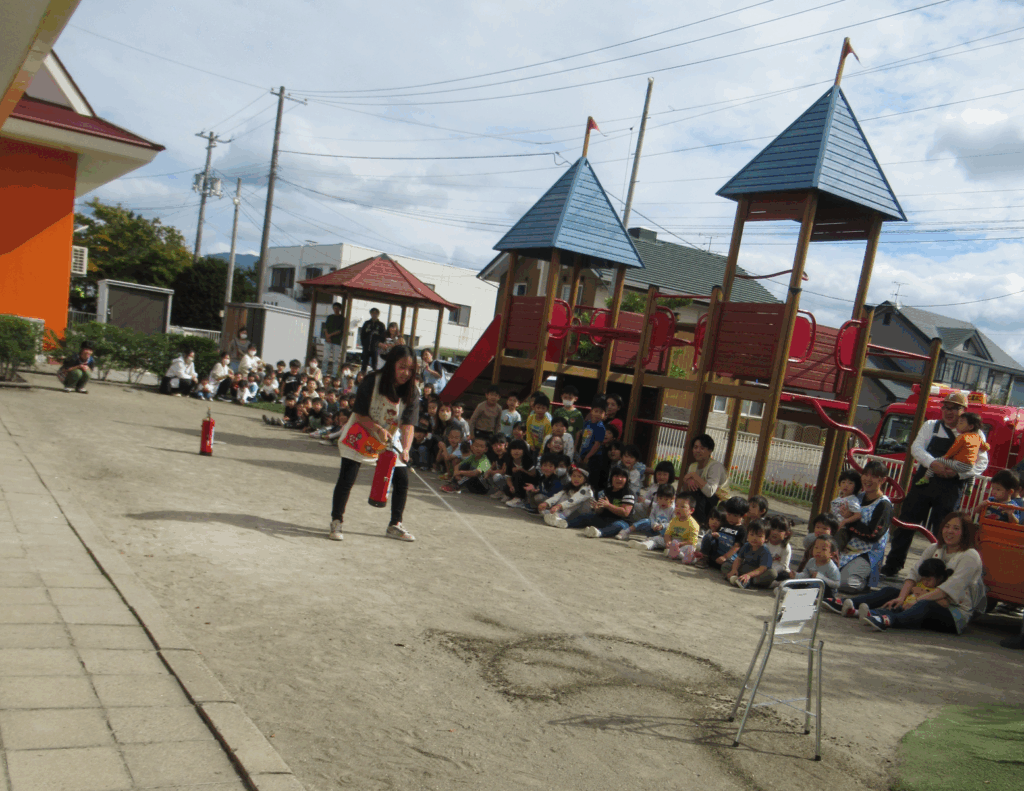 この日は、消火訓練も行い、代表して先生たちや参観にきていた保護者の方にも